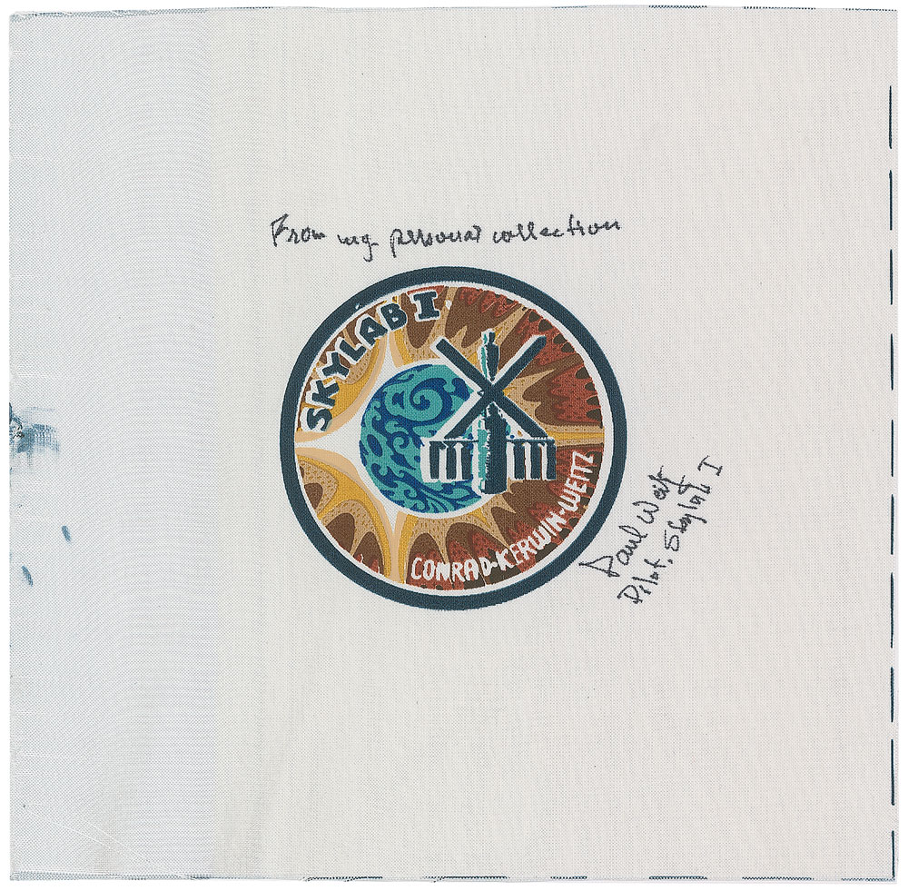 Two Beta cloth swatches, both approximately 9 x 9 and bearing a 3.5″ diameter Skylab I (SL–2) mission insignia in the center, both signed in black felt tip, “Paul Weitz, Pilot Skylab I,” with Weitz adding to one, “From my personal collection.” In overall fine condition. Pre-certified Zarelli Space Authentication.