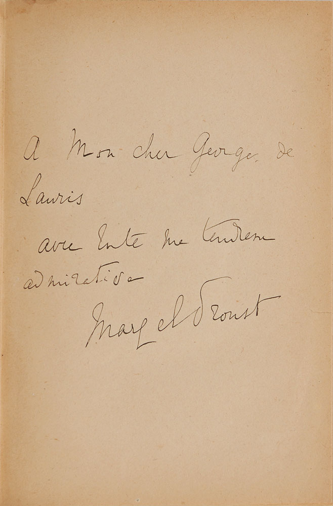 Signed book: Pastiches et Melanges. Second edition. Paris: Nouvelle Revue Francaise, 1919. Rebound marbled hardcover with original wrappers inside, 5.5 x 7.5, 272 pages. Signed and inscribed on the first free end page in crisp ink, “A Mon cher George de Lauris, avec toute ma tendresse admirative, Marcel Proust.” Autographic condition: fine, with light age toning to interior pages. Book condition: VG-/None. Proust was introduced to Georges de Lauris through his friend Antoine Bibesco in 1902, and they soon became friends and frequently wrote to each other; the correspondence between Proust and de Lauris was published by Amiot-Dumont in 1948. Pastiches et Melanges, known as The Lemoine Affair in English, was inspired by the true French scandal involving fraudster Henri Lemoine, who claimed to be able to manufacture synthetic diamonds. Any signed books from Proust are extremely desirable, and this copy’s association with a member of his inner circle elevates it further. Pre-certified PSA/DNA.