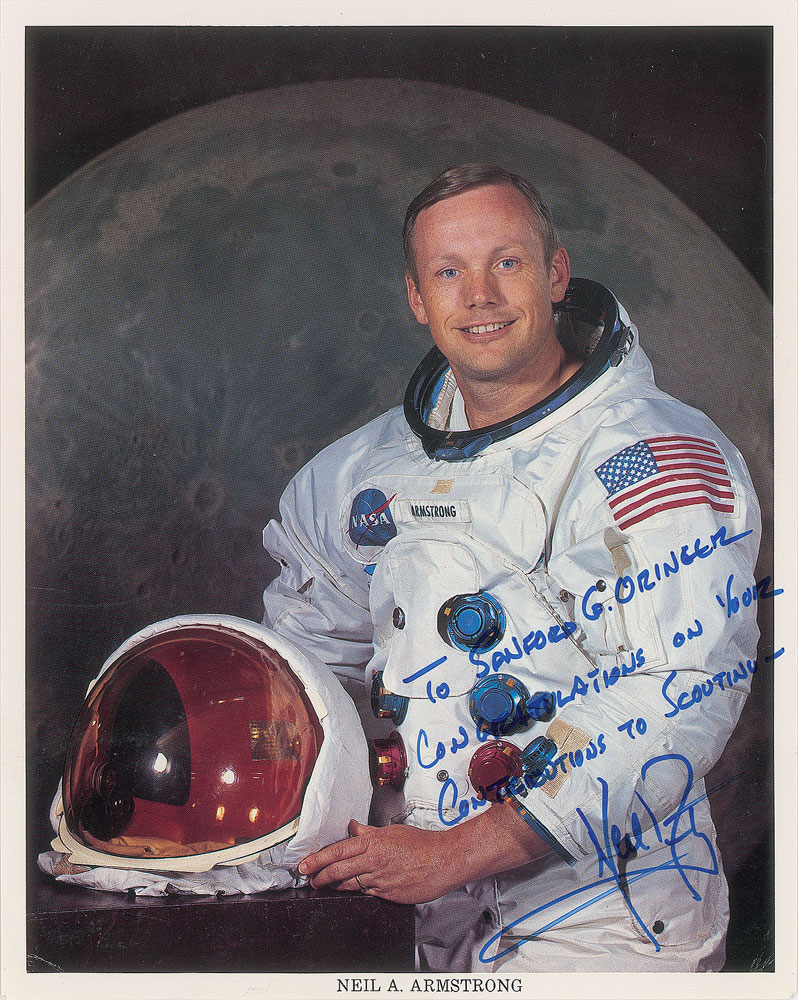 Official color 8 x 10 NASA lithograph of Armstrong posing in his white space suit against a lunar backdrop, signed and inscribed in blue felt tip, “To Sanford G. Oringer, Congratulations on your contributions to scouting—Neil Armstrong.” In very good to fine condition, with light overall rippling and a paperclip impression to the upper left corner. Pre-certified Zarelli Space Authentication.