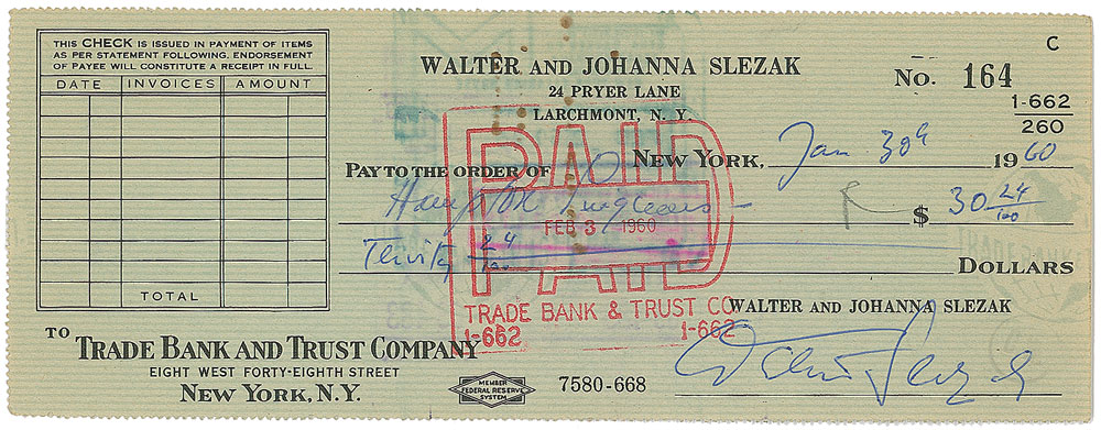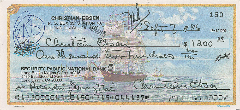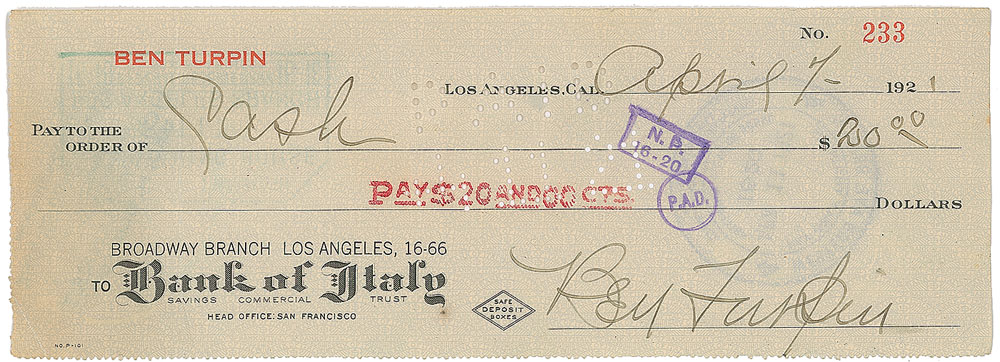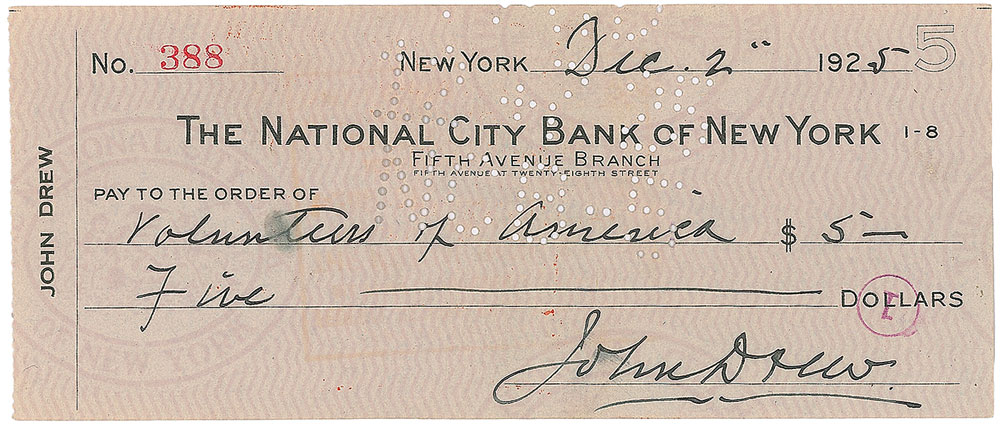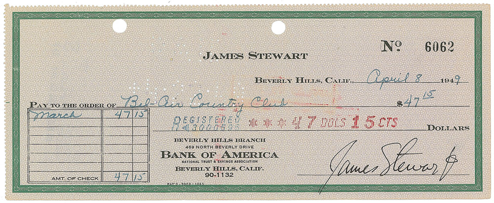 Collection of five checks, each signed by an actor, including: John Drew, James Stewart, Walter Slezak, Buddy Ebsen, and Ben Turpin. The Ebsen check is made payable to himself and also endorsed on the reverse. In overall fine condition. Pre-certified PSA/DNA.