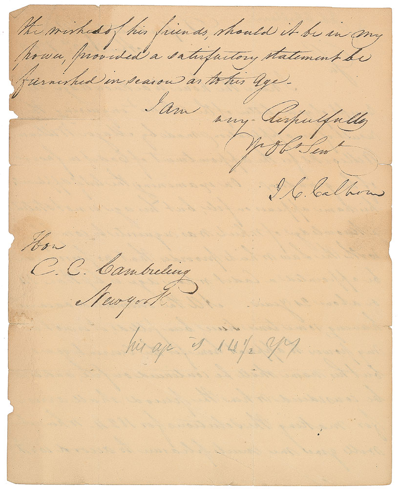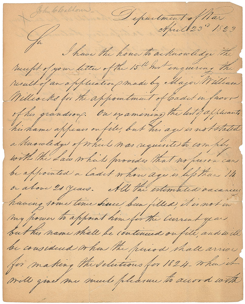 LS signed “J. C. Calhoun,” one page, 8 x 9.75, April 23, 1823. Letter concerning the requested appointment of a cadet, in part: “On examining the list of applicants his name appears on file, but his age is not stated a knowledge of which was requisite to comply with the Law which provides that no person can be appointed a Cadet whose age is less than 14 or above 21 years. All the estimated vacancies having been filled, it is not in my power to appoint him for the current year.” Includes the original address leaf accomplished in another hand and franked in the upper left, “J. C. Calhoun.” In very good condition, with scattered toning, splitting along intersecting folds, and seal-related paper loss to detached (but present) integral address leaf. Pre-certified PSA/DNA.