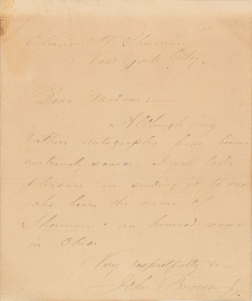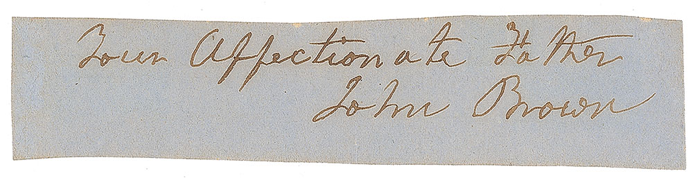 Ink signature, “Your Affectionate Father, John Brown,” on a light blue 4 x 1 slip clipped from the close of a letter. Includes the original transmittal letter written by Brown’s son, John Brown, Jr., in full: “Although my father’s autograph has become scarce, I yet take pleasure in sending it to one who bears the name Sherman, an honored name in Ohio.” In fine condition, with fading and light toning to the son’s transmittal letter. Pre-certified PSA/DNA.