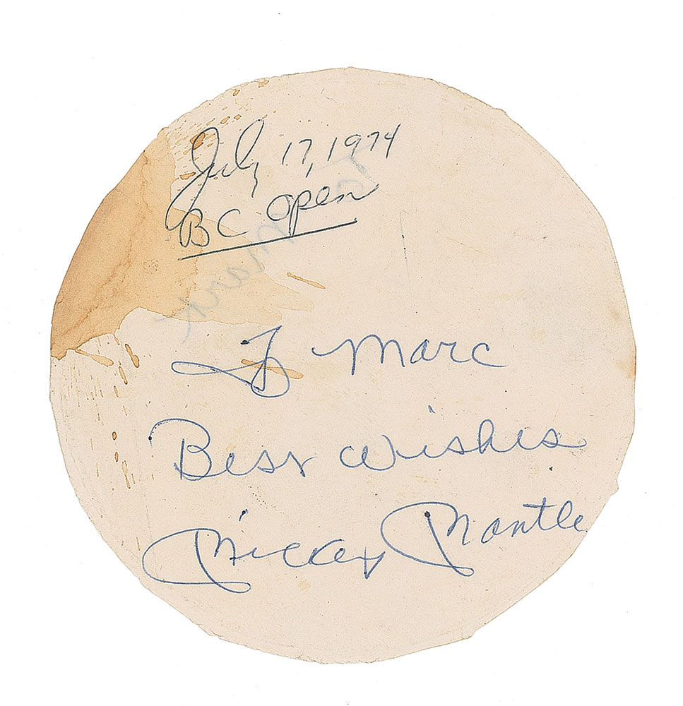 Ballpoint signature and inscription, “To Marc, Best wishes, Mickey Mantle,” on a white 3.5 x 3.5 slip trimmed into a circle. Collector’s notation near the top indicates it was obtained at the Brown County ‘BC’ Open golf tournament in New York on July 17, 1974. In very good condition, with light soiling and a stain to upper left. Pre-certified PSA/DNA.