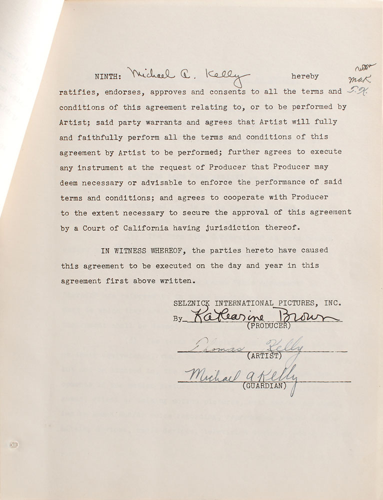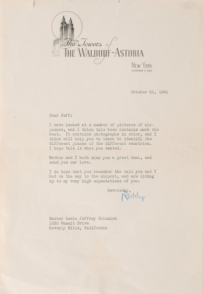 TLS signed “Daddy,” one page, 7.25 x 10.5, The Towers of the Waldorf–Astoria letterhead, October 21, 1941. Letter to his son, Jeffrey Selznick, in full: “I have looked at a number of pictures of airplanes, and I think this book contains much the best. It contains photographs in color, and I think will help you to learn to identify the different planes of the different countries. I hope this is what you wanted. Mother and I both miss you a great deal, and send you our love. I do hope that you remember the talk you and I had on the way to the airport, and are living up to my very high expectations of you.” Includes an original Selznick International Pictures contract, seventeen pages, dated February 25, 1937, signed at the conclusion by Thomas Kelly, the young actor who was handpicked by Selznick to star as the titular lead character in the film The Adventures of Tom Sawyer. In overall fine condition, with two small edge tears to the letter and expected wear to the document. Pre-certified PSA/DNA.