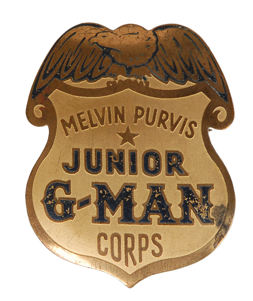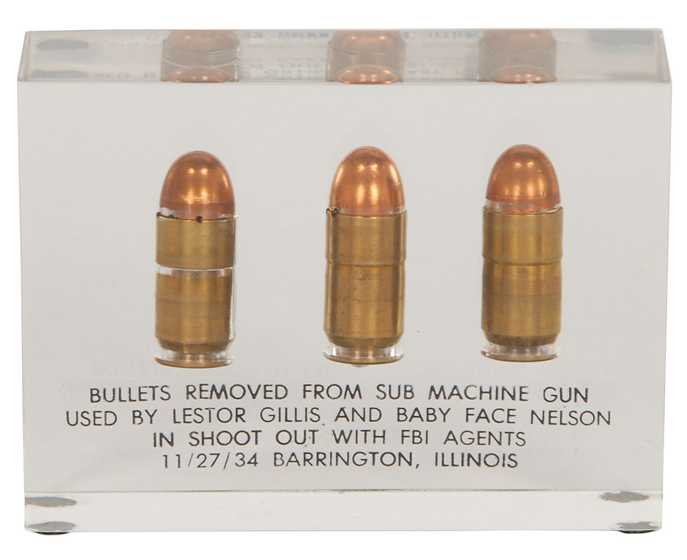 Three .45 caliber bullets said to have been recovered from Baby Face Nelson’s submachine gun following the deadly ‘Battle of Barrington’ on November 27, 1934. The bullets are encased in a 3.75 x 2.75 x 1 acrylic block with the attributing caption below. Also includes two small glossy 1934 press photos featuring identical images of Nelson, as well as a 1937 press photo of FBI agent Melvin Purvis and a Purvis ‘Junior G Men’ souvenir badge. In fine condition. Lester Gillis, better known as Baby Face Nelson, was tracked down by Purvis and killed by FBI agents in the Battle of Barrington shootout, bringing an end to the crime spree that made him ‘public enemy number one.’
