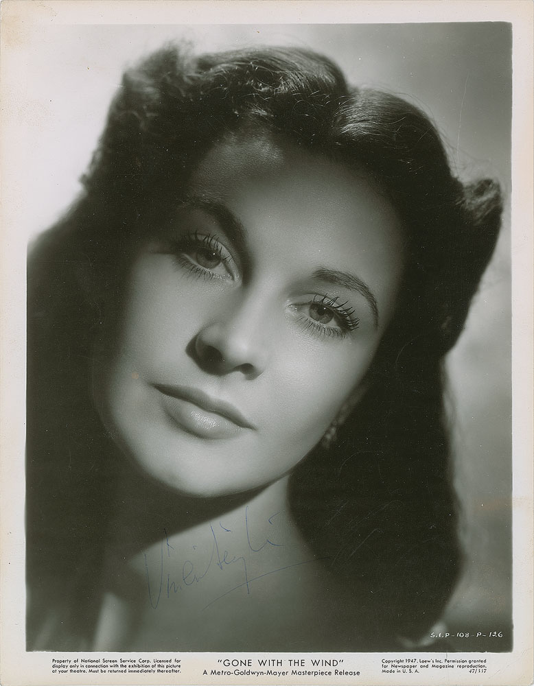 Highly desirable glossy 8 x 10.25 MGM publicity photo of Vivien Leigh as Scarlett O’Hara from the 1939 classic Gone With the Wind, signed in blue ballpoint. In very good to fine condition, with scattered light overall creasing. A simply beautiful close-up of Leigh in her Oscar-winning turn as the film’s strong-willed protagonist, and a lovely example of one of Hollywood’s most sought-after signed photographs. Pre-certified PSA/DNA.