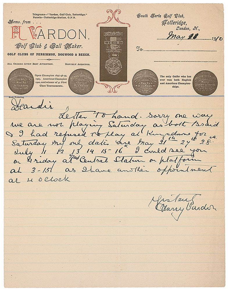 Golfer from the Bailiwick of Jersey (1870–1937) who won The Open Championship six times. He is a member of golf’s fabled ‘Great Triumvirate,’ along with John Henry Taylor and James Braid. Rare ALS, one page, lightly-lined, 8 x 10.5, Vardon’s business letterhead, May 28, 1910. Letter to a gentleman, in part: “Sorry one way we are not playing Saturday as both Braid & I had refused to play at Kingsdowne [sic] for Saturday.” Central vertical and horizontal folds with slight edge separations, otherwise fine condition. The only handwritten Vardon letter we have ever offered. Pre-certified PSA/DNA.