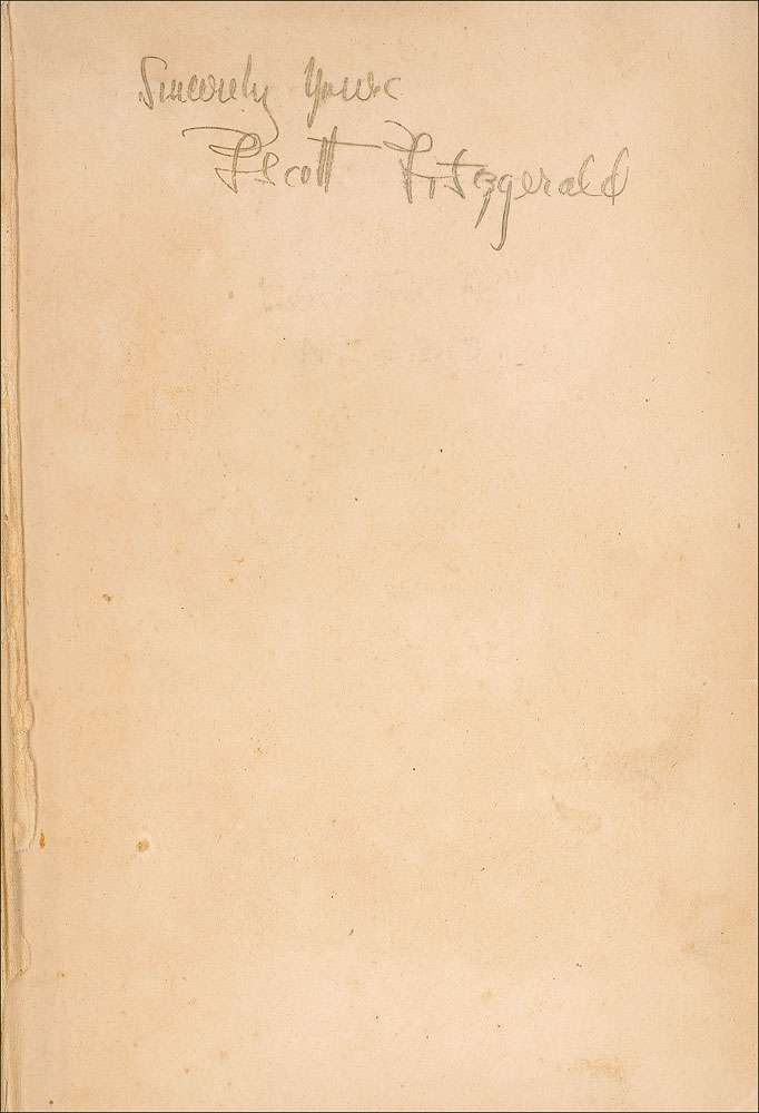 Signed book: Flappers and Philosophers. First edition, later printing. NY: Charles Scribner’s Sons, 1920. Hardcover with dust jacket, 5.5 x 7.75, 269 pages. Signed on the first free end page in ink, “Sincerely yours, F. Scott Fitzgerald.” Toning and soiling to signed page, separation along front hinge, wear and staining to covers and spine, and light toning, soiling, and creasing to dust jacket, otherwise very good condition. An early, uninscribed title from this desirable literary giant. Pre-certified PSA/DNA.
