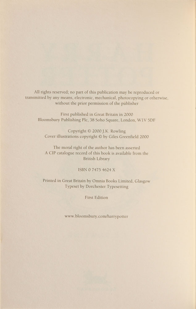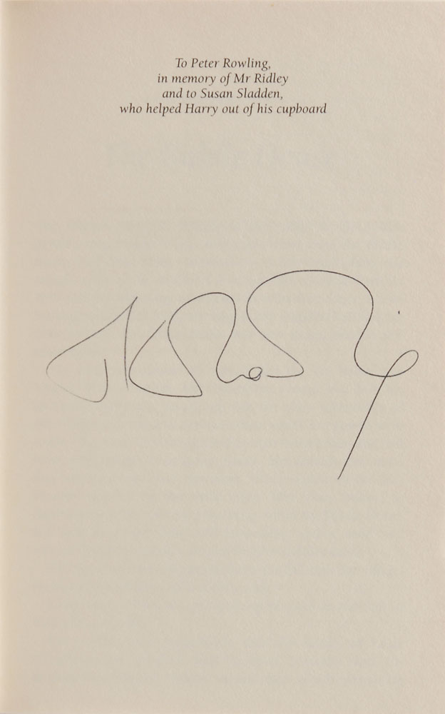Signed book: Harry Potter and the Goblet of Fire. First edition. London: Bloomsbury, 2000. Hardcover with dust jacket, 5.25 x 8, 636 pages. Signed on the dedication page in black ballpoint, “J. K. Rowling.” In fine condition, with a tiny crack to front hinge. Pre-certified PSA/DNA.