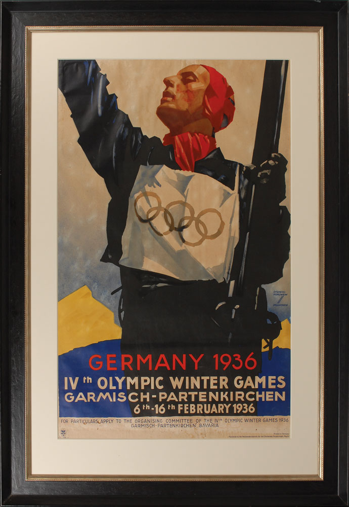 Rare color 24 x 39 English variant of the official poster designed by Ludwig Hohlwein for the 1936 Garmisch Winter Olympics. The poster portrays a skier against an alpine background and reads: “Germany 1936, IVth Olympic Winter Games, Garmisch-Partenkirchen, 6th–16th February 1936,” with smaller text below, “For particulars apply to the Organising Committee of the IVth Olympic Winter Games 1936, Garmisch-Partenkirchen, Bavaria.” Impressively matted and framed to an overall size of 35.5 x 51.5. In very good to fine condition, with some foxing and restoration. These posters were released in thirteen languages and distributed worldwide. Oversized.