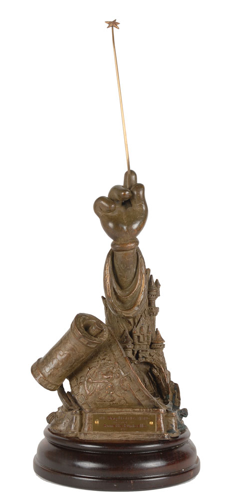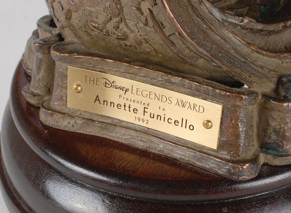 Rare bronze Disney Legends Award given to Annette Funicello to honor her contributions to the Walt Disney Company, measuring 22″ tall and set on an 8.5″ diameter wooden base, weighing 14.2 pounds, with an engraved plaque on the front, “The Disney Legends Award, Presented to Annette Funicello, 1992.” The gorgeous award statuette portrays Mickey’s arm rising up from a swirl of creativity to hold up a star-tipped magic wand. Funicello was honored as a ‘Disney Legend’ on October 21, 1992, one day prior to her 50th birthday. Her original trophy was lost in a fire at her home and replaced by Disney with this example in 2011.