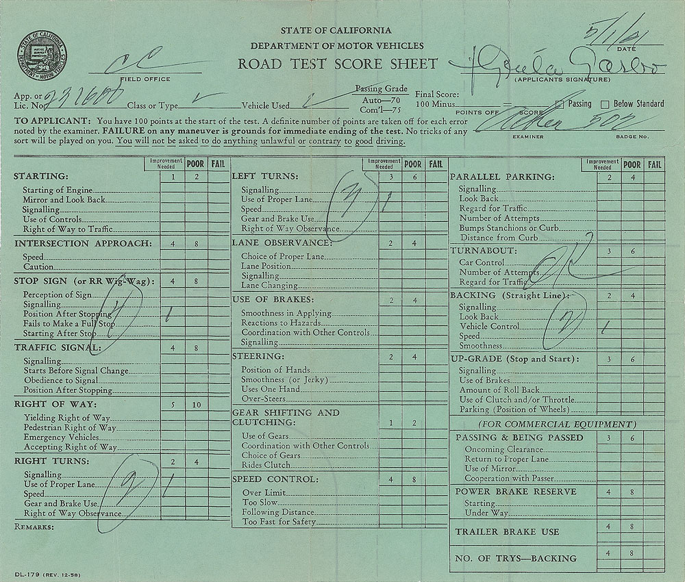 DS, one page, 10 x 8.5, May 1, 1961. State of California Department of Motor Vehicles “Road Score Test Sheet,” filled out by the examiner with scores in the sections headed “Stop Sign,” “Right Turns,” “Left Turns,” and “Backing (Straight Line).” Signed in the upper right by Garbo as the driver’s license applicant. In fine condition. Pre-certified PSA/DNA.