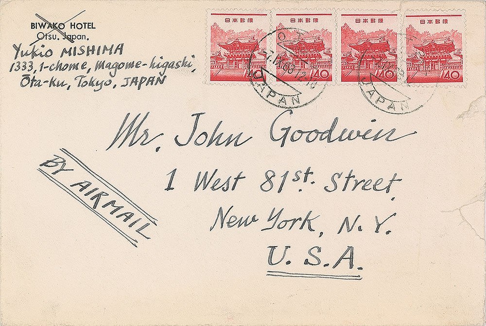 ALS, three pages, 10 x 7, Biwako Hotel letterhead, September 5, 1963. Letter to novelist John Goodwin, in part: “I finally got a chance to read your ‘A View of Fuji’…Your book is lovely and beautiful like a small artificial Japanese garden with its unexpressable melancholy. I should say I am one of most chosen reader of this novel, because I think I can feel both side of this story. As the matter of fact, I have personally known such a sort of sentimental, weak, stupid, poor, and on the contrary extremely strong by his natural mysticism. On the other hand, I also know a lonesome tourist’s psychology in a foreign country…Now I am on a tip at Shiga Prefecture near by Kyoto to gather materials for my new novel. It will be a satiric novel of a president of a big silk-weaving company who pretends like a ‘big daddy’ to all labourers and double-crossed by them by a big terrible strike.” In fine condition. Accompanied by the original mailing envelope addressed in Mishima’s own hand, incorporating his full name in the return address area. The project Mishima refers to in this letter was published the following year under the title Silk and Insight. A lengthy, extremely desirable letter by the renowned author. Pre-certified PSA/DNA.