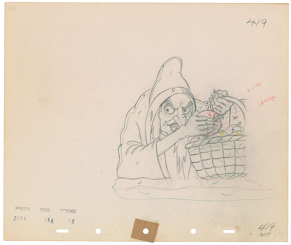 (Walt Disney Studios, 1937) Original production drawing of the Wicked Witch from Snow White and the Seven Dwarfs, showing the conniving witch with a basket of poisoned apples, with artist instructions to right. Stamped in the lower left, “Prod. 2001, Seq. 13A, Scene. 15.” Accomplished in graphite and colored pencil on untrimmed 12 x 10 animation paper. Image measures 6.75 x 6. In fine condition.