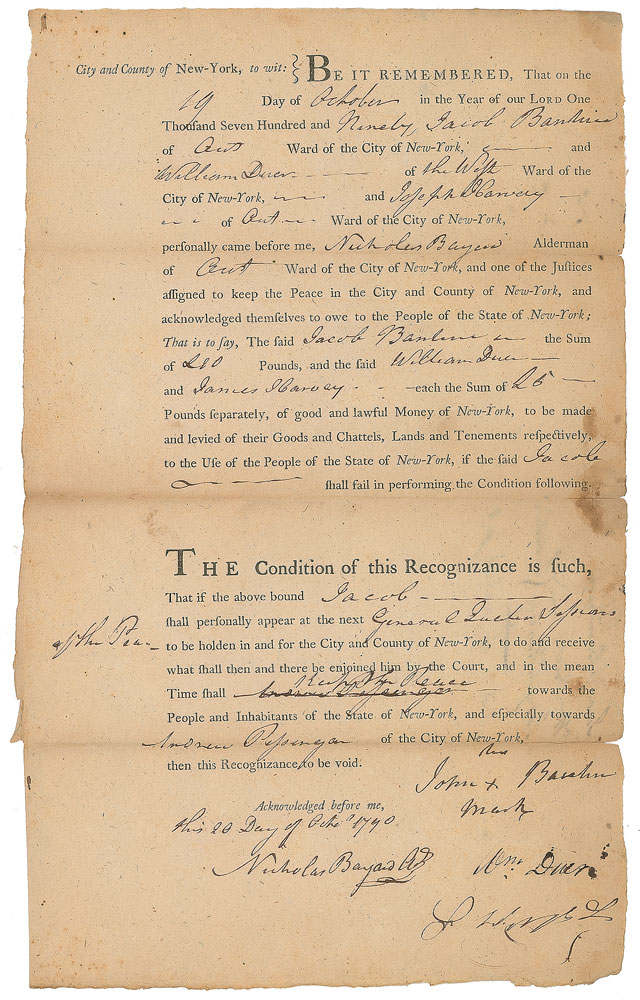 Lawyer, developer, and speculator from New York (1743–1799) who served in the Continental Congress and signed the Articles of Confederation. Partly-printed DS, signed “Wm: Duer,” one page, 8 x 13, October 19, 1790. Document concerning bail in the case of Jacob Bandine, signed at the conclusion by Duer. In very good to fine condition, with small splits along folds, and light staining and toning along the right edge. Pre-certified PSA/DNA.