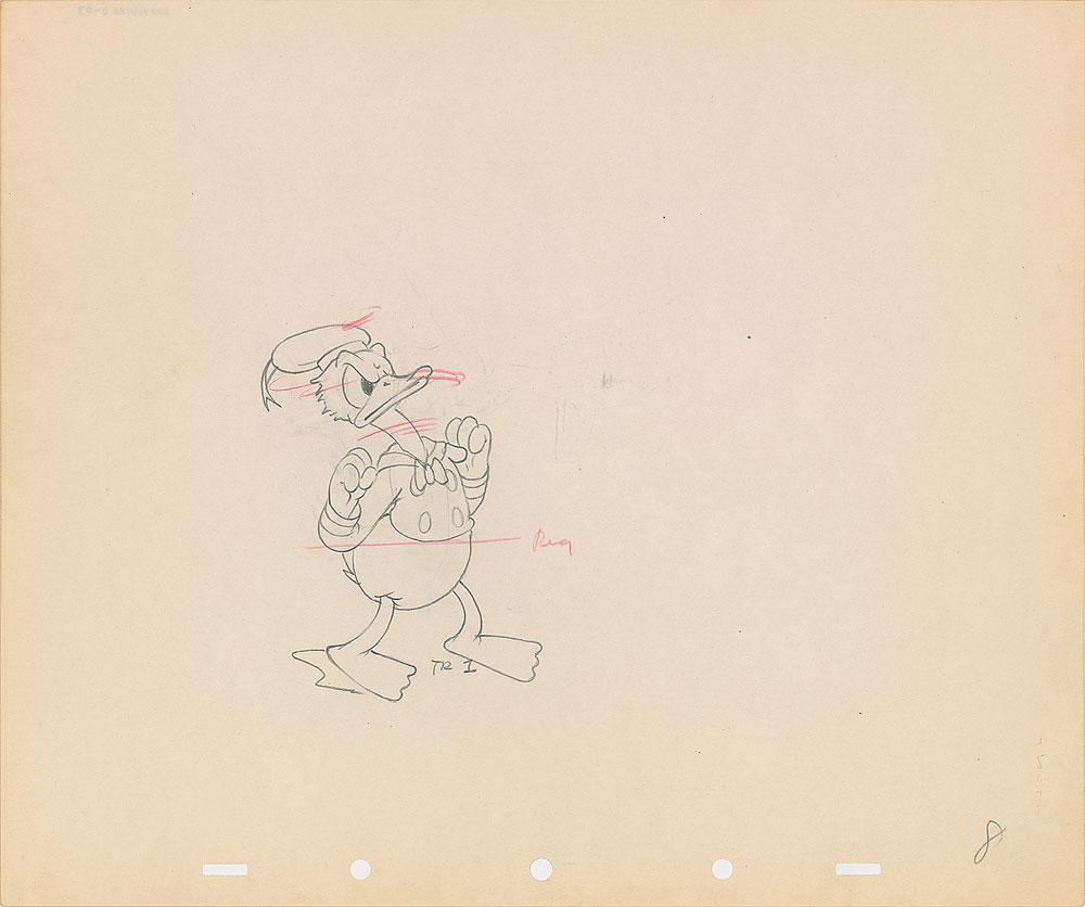 (Walt Disney Studios, circa 1937) Original production drawing featuring Donald Duck in a feisty pose. Accomplished in graphite on untrimmed 12 x 10 animation paper. Image measures 3.25 x 4.25. In fine condition.