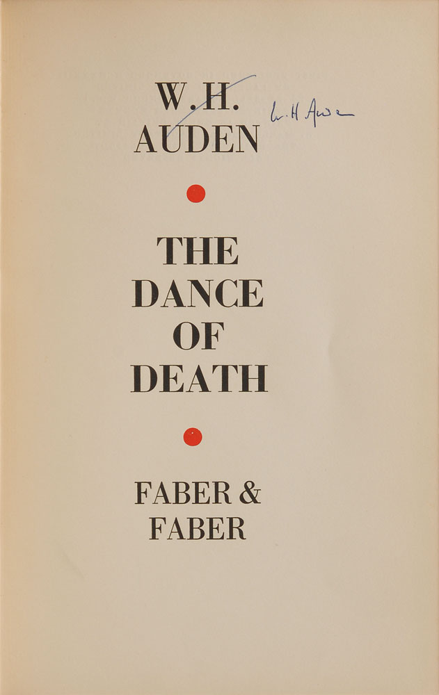 Signed book: The Dance of Death. Later printing. London: Faber & Faber, 1935. Hardcover with dust jacket, 5.75 x 9, 38 pages. Signed on the title page in blue ballpoint by Auden. In very good to fine condition, with staining, toning, and small edge tears to dust jacket. Pre-certified PSA/DNA.