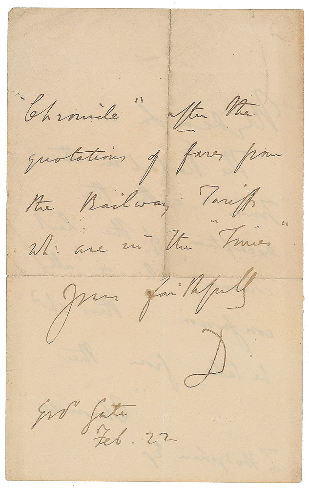 ALS signed “D,” one page both sides, 4.25 x 7, February 22. Written from Grosvenor Gate, a letter to T. Hodgkin, in full: “The Report in the ‘Times’ with the exception of the last column, which is all confusion—this should be taken from the ‘Chronicle’ ‘Chronicle’ [sic] after the quotations of fares from the Railway Tariff which are in the ‘Times.’” In very good to fine condition, with small tears and toning along edges. Pre-certified PSA/DNA.