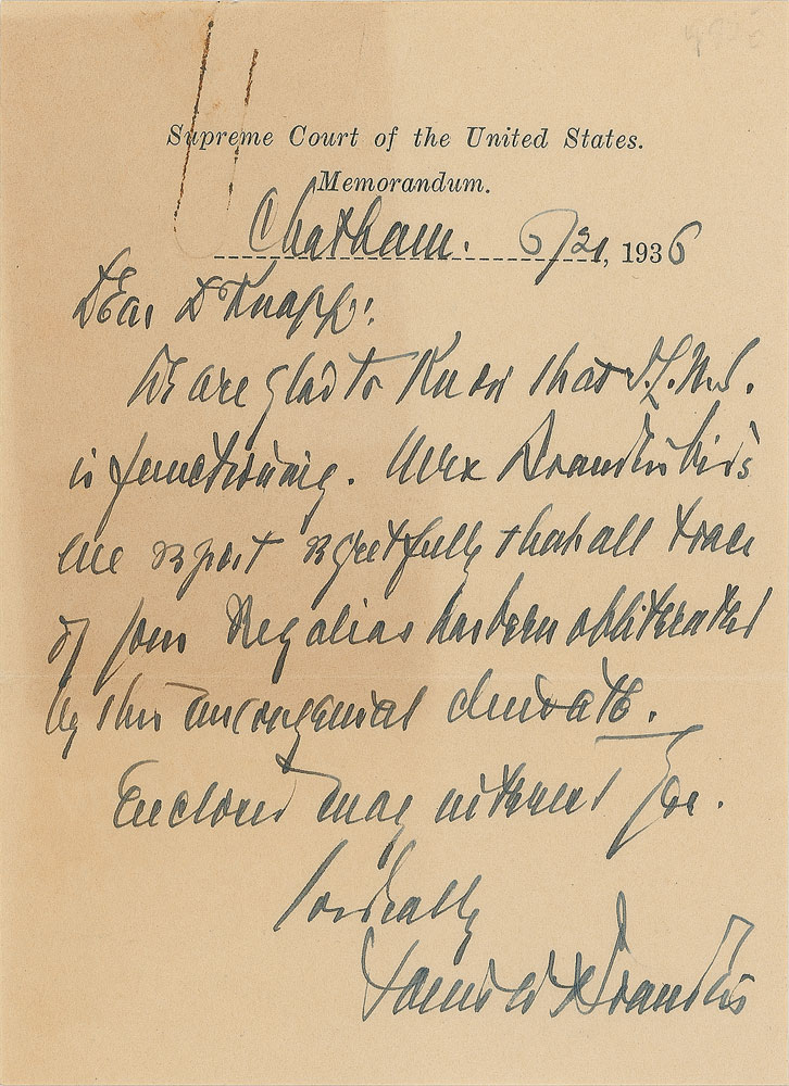 ALS, one page, 4 x 5.5, Supreme Court of the United States letterhead, June 21, 1936. Written from Chatham, Brandeis expresses his dismay over a report that a friend’s regalia have “been obliterated by this uncongenial climate.” In very good to fine condition, with a rusty paperclip impression to top edge, and a block of light toning to left side. Pre-certified PSA/DNA.