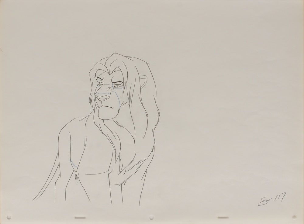 (Walt Disney Studios, 1994) Original production drawing featuring Mufasa from The Lion King, offering a wonderful portrayal of the mighty lion. Accomplished in graphite and colored pencil on untrimmed 17 x 12.5 animation paper. Image measures 7.5 x 8.5. In fine condition.