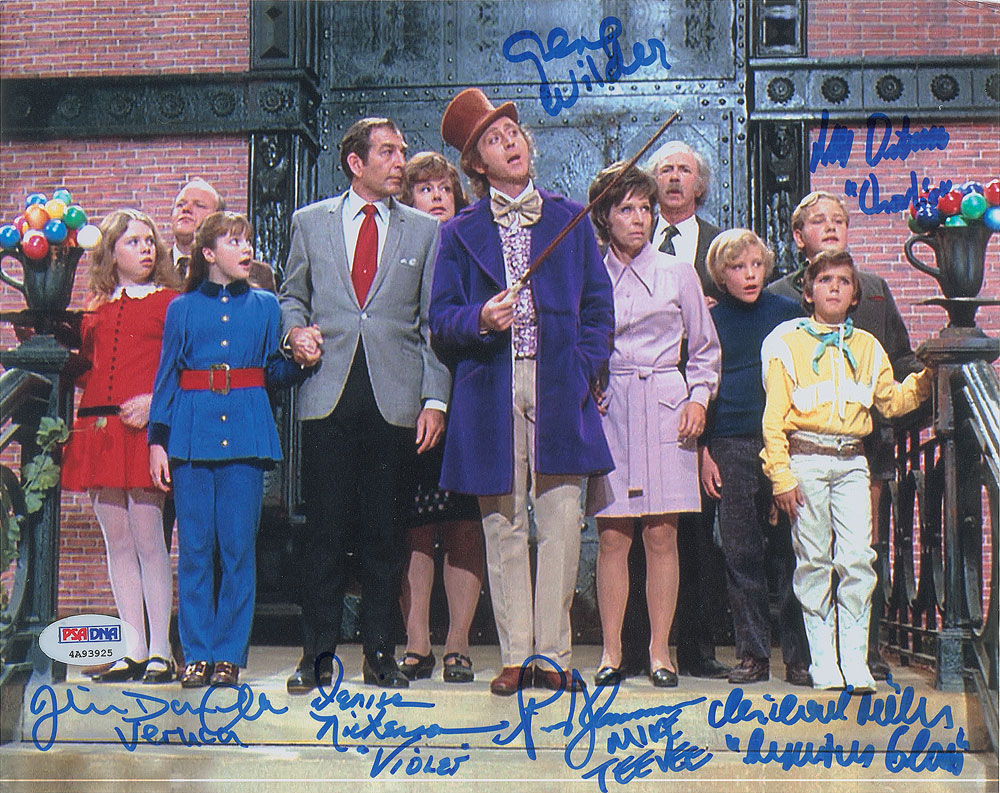 Color satin-finish 10 x 7.75 photo of Willy Wonka giving a tour of his enormous chocolate factory, signed in blue felt tip by Gene Wilder, Peter Ostrum, Julie Dawn Cole, Denise Nickerson, Paris Themmen, and Michael Bollner, with all but Wilder adding their respective character names from the 1971 film. In fine condition, with a slightly grainy quality to the image. Accompanied by a full letter of authenticity from PSA/DNA.