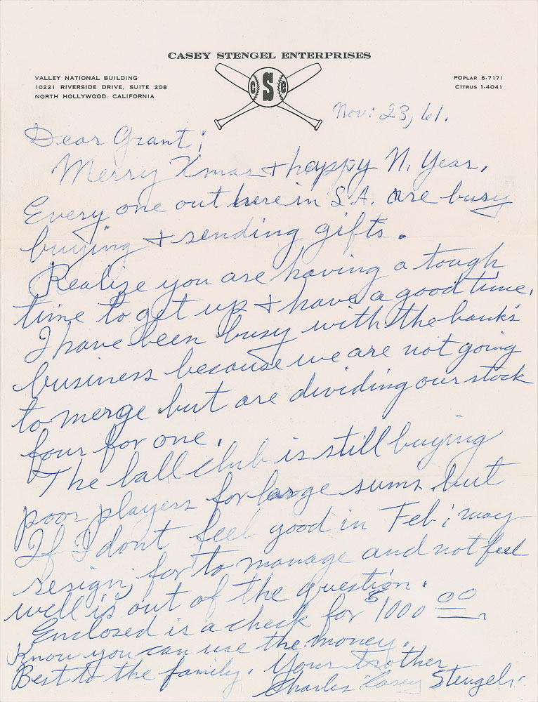 ALS signed “Charles Casey Stengel,” one page, 8.5 x 11, personal letterhead, November 23, 1961. Letter to his brother Grant Stengel, in full: “Merry Xmas + happy N. Year. Every one out here in S. A. are busy buying + sending gifts. Realize you are having a tough time to get up + have a good time. I have been busy with the bank’s business because we are not going to merge but are dividing our stock four for one. The ball club is still buying poor players for large sums but if I don’t feel good in Feb I may resign; for to manage and not feel well is out of the question. Enclosed is a check for $1000.00. Know you can use the money. Best to the family.” In fine condition. Accompanied by an unsigned photograph, and the original mailing envelope, addressed in Stengel’s own hand. Also accompanied by a letter of provenance from a relative of Stengel. Pre-certified PSA/DNA.