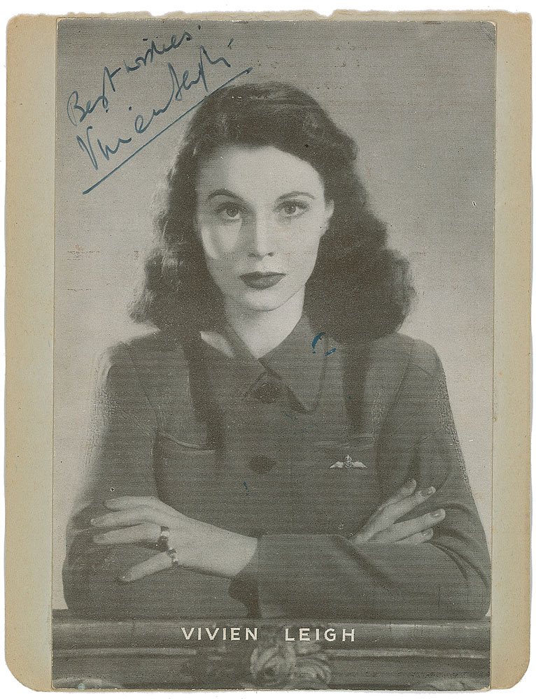 Uncommon 4 x 6 postcard photo of Leigh with her arms crossed in a half-length pose, signed in fountain pen, “Best wishes, Vivien Leigh.” Affixed to a slightly larger album page. Some light scuffing to the image, otherwise fine condition. Accompanied by a letter of provenance from the original recipient. Pre-certified PSA/DNA.