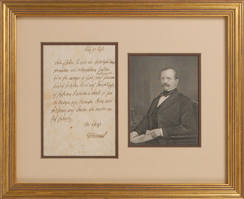 Uncommon ALS in German, signed “v. Bismarck,” one page, 5.25 x 8.25, September 30, 1863. As cabinet president and minister of foreign affairs, Bismarck pens a letter to Carl Zitelman, asking him to send various documents to Kaiser Wilhelm I of Prussia and Count Friedrich of Eulenberg, Minister of the Interior. Double-matted and framed with an engraving to an overall size of 18.25 x 15. In very good to fine condition, with scattered light toning and foxing. Pre-certified PSA/DNA.