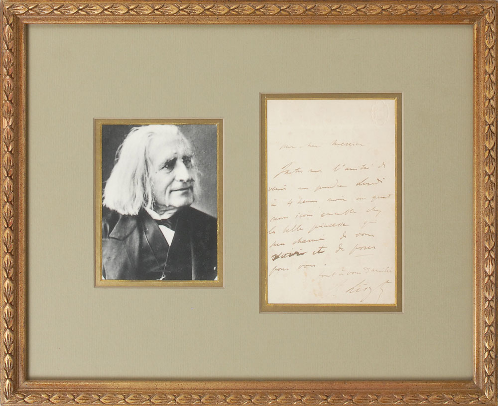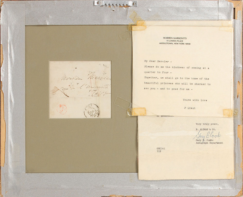 ALS in German, signed “F. Liszt,” one page, 4 x 6.25, personal embossed letterhead, no date but postmarked April 26, 1835. Letter to Monsieur Mercier, in full (translated): “Please do me the kindness of coming at a quarter to four. Together, we shall go to the home of the beautiful princess who will be charmed to see you, and to pose for me.” Addressed on the reverse in Liszt’s own hand. Double-matted and framed with an image of the composer and a viewing window on the reverse. In fine condition, with scattered light soiling. Pre-certified PSA/DNA.