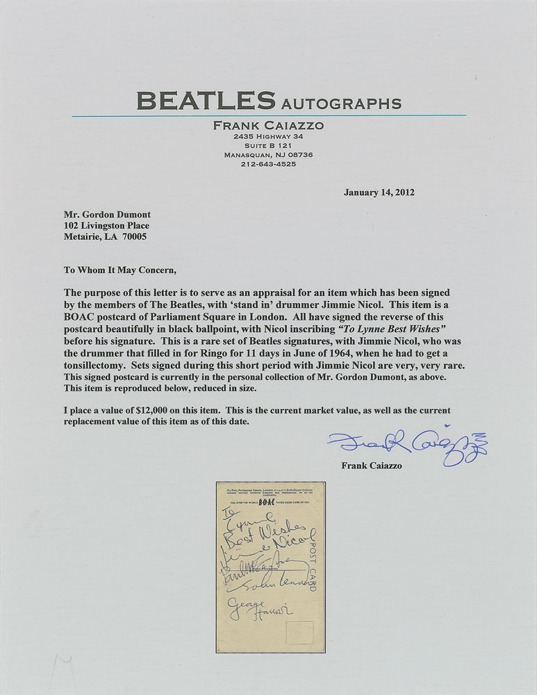 Vintage circa 1964 color postcard published by BOAC (British Overseas Airways Corporation) depicting London’s famous Big Ben, 5.5 x 3.5, signed and inscribed on the reverse in crisp black ballpoint, “To Lynne, Best Wishes, Jimmie Nicol,” “Paul McCartney,” “John Lennon,” and “George Harrison.” In very good condition, with staple holes to one corner and moderately heavy overall creasing (the signed side displays quite cleanly nonetheless). Accompanied by a letter of authenticity from noted Beatles expert Frank Caiazzo, in part: “This is a rare set of Beatles signatures, with Jimmie Nicol, who was the drummer that filled in for Ringo...in June of 1964…Sets signed during this short period…are very, very rare.” Nicol replaced Ringo Starr from June 3–15, 1964, at the start of the Beatles’ World Tour, while Ringo was suffering from tonsillitis and pharyngitis. An extremely rare piece, as Nicol was with the Beatles for under two weeks, playing a total of eight shows. Pre-certified REAL.