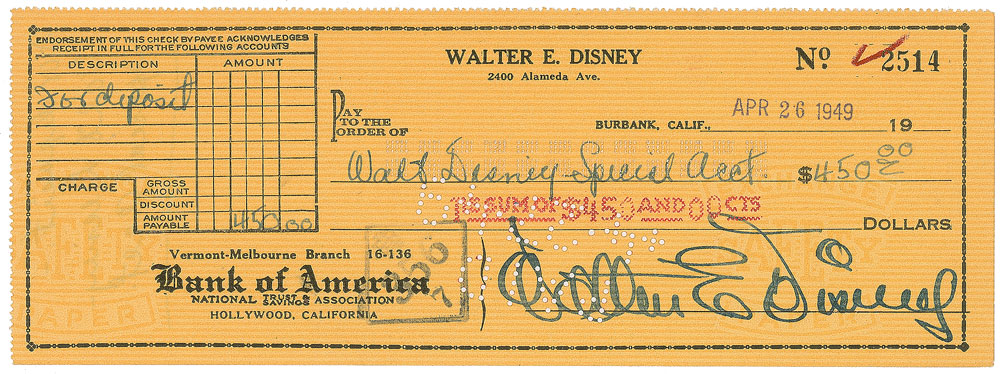Personal check, 8.5 x 3, filled out in another hand and signed boldly by Disney, “Walter E. Disney,” payable to Walt Disney—Special Acct. for $450, stamp-dated April 26, 1949. In fine condition. A strong and attractive example. Pre-certified Phil Sears.