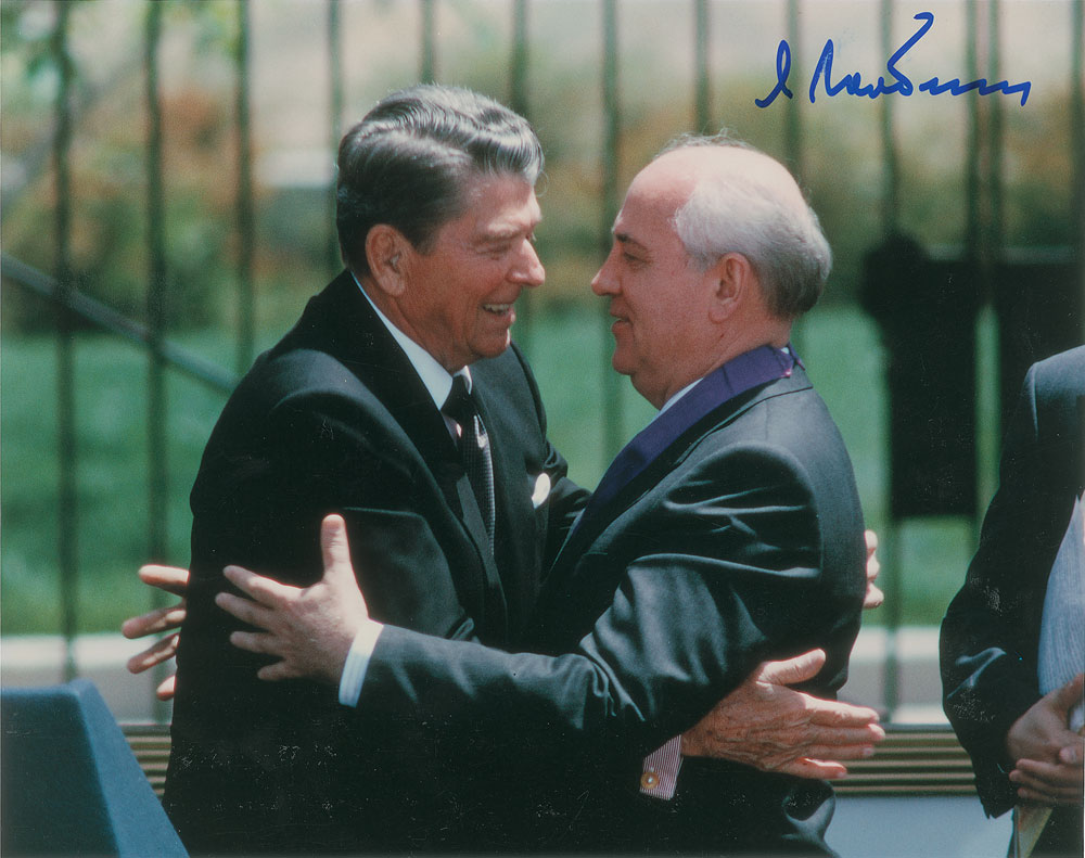 Color glossy 10 x 7.75 photo of Gorbachev embracing Ronald Reagan, signed in blue felt tip by Gorbachev. In fine condition, with trivial soiling and an evenly trimmed bottom edge. Accompanied by a certificate of authenticity from Score Board. Pre-certified PSA/DNA.