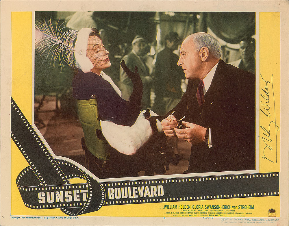 Color lobby card for the 1950 Paramount film Sunset Boulevard, 14 x 11, vertically signed in the right border in black ink by Wilder. In fine condition. Pre-certified PSA/DNA.