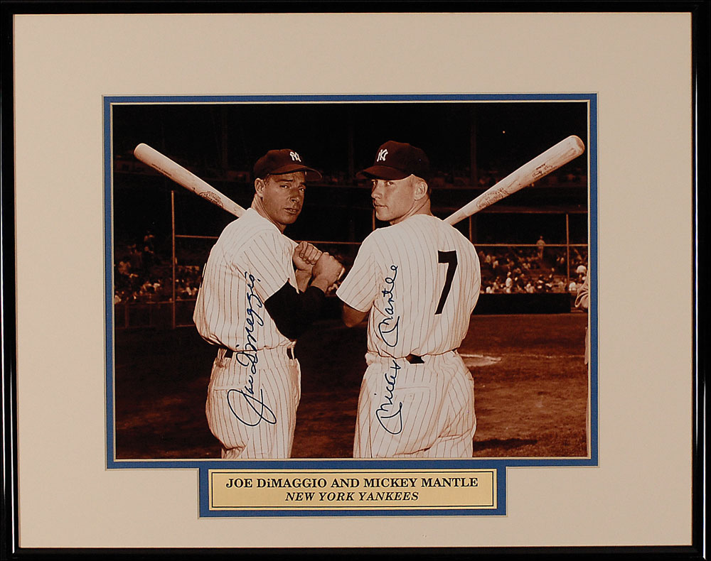 Ideal glossy 13.5 x 10 photo of the two Yankee sluggers posing with bats on their shoulders prior to a game, vertically signed in black felt tip by Joe DiMaggio and Mickey Mantle. Double-matted and framed. In fine condition. Pre-certified PSA/DNA.