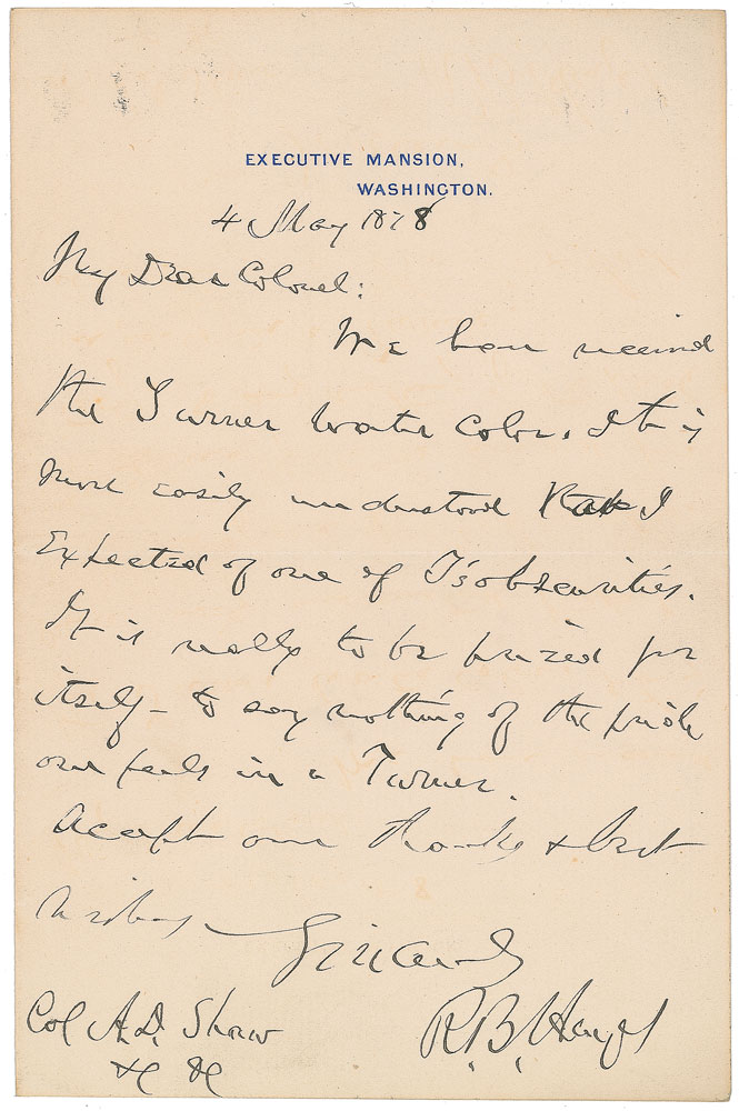 ALS as president signed “R. B. Hayes,” one page, 4.5 x 6.75, Executive Mansion letterhead, May 4, 1878. Letter to Colonel A. D. Shaw, concerning a watercolor painting for the White House collection by English landscape painter J. M. W. Turner, in full: “We have received the Turner water color. It is more easily understood than I expected of one of T’s obscurities. It is really to be prized for itself—to say nothing of the pride one feels in a Turner.” In fine condition.