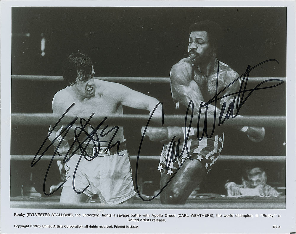 Ideal glossy 10 x 8 United Artists publicity photo of Rocky Balboa and Apollo Creed slugging it out during the finale of the 1976 film Rocky, signed in black felt tip by Sylvester Stallone and Carl Weathers. In fine condition. Accompanied by a full letter of authenticity from PSA/DNA.