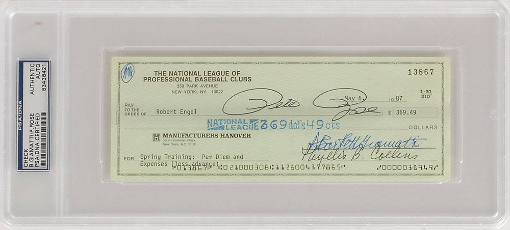The National League of Professional Baseball Clubs business check, 8.25 x 3, filled out in type and signed by Giamatti, “A. Bartlett Giamatti,” payable to Robert Engel for $369.49, May 6, 1987. Also signed at the top in black ballpoint, “Pete Rose.” Encapsulated in a plastic PSA/DNA authentication holder. In fine condition.