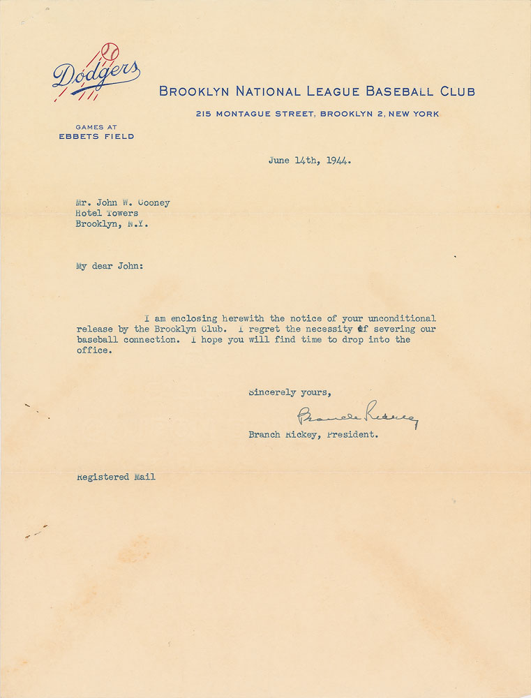 TLS, one page, 8.5 x 11, Brooklyn National League Baseball Club letterhead, June 14, 1944. Letter to John W. Cooney, in full: “I am enclosing herewith the notice of your unconditional release by the Brooklyn Club. I regret the necessity of severing our baseball connection. I hope you will find time to drop into the office.” In fine condition, with staple holes to upper left corner and some light toning. Johnny Cooney enjoyed a 20-year career as a multi-positional baseball player for teams such as the Boston Braves, the Brooklyn Dodgers, and the New York Yankees. After his playing career, Cooney spent another twenty years as a manager. Pre-certified PSA/DNA.