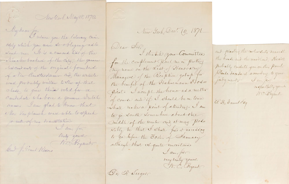 Three ALSs, each signed “W. C. Bryant,” four pages in total, lightly-lined, ranging in size from 3.75 x 6 to 5 x 8, dated between 1865 and 1871. The first, in part: “I have also said that if you thought that the southeast lot as my place, beyond the woods would be tamed to as good account by planning it with apple trees as any other way.” Another, in full: “I thank your Committee for the compliment paid me in putting my name on the list of Honorary Managers of the Reception got up for the benefit of the Hahnemann Hospital. I accept the honor as a matter of course and if I should be in town shall make a point of attending. I am to go south somewhere about the middle of the winter and it may possibly be that I shall find it necessary to go before the 30th. of January although that is quite uncertain.” In overall very good to fine condition. Pre-certified PSA/DNA.
