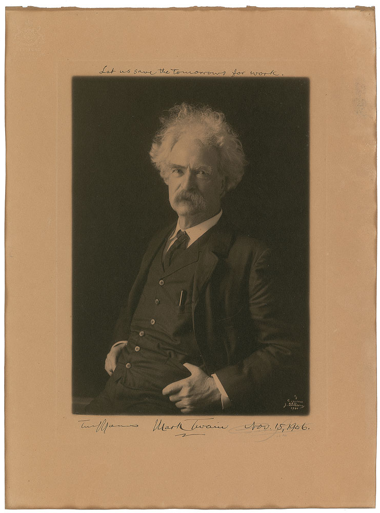 Exceptional matte-finish 10 x 13.5 half-length portrait of Clemens, signed above and below the image in black ink, “Let us save the tomorrows for work. Truly yours, Mark Twain, Nov. 15, 1906.” Also signed in pencil by the photography studio, Gessford, and blindstamped in the upper left. In fine condition, with some light rippling, primarily to the right border. An outstanding photograph enhanced by the addition of one of the great American humorist’s famous maxims. Pre-certified PSA/DNA.