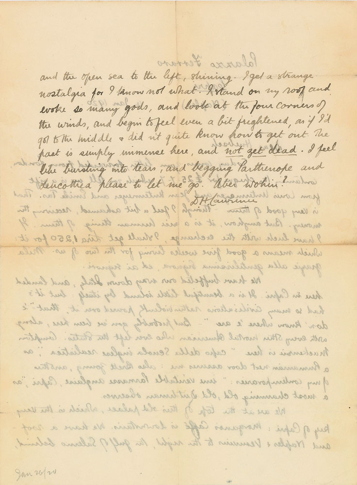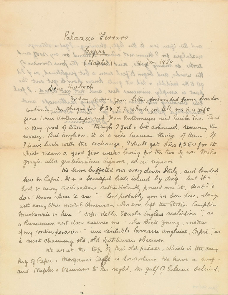 ALS, one page both sides, 8.5 x 11, January 4, 1920. Written from Palazzo Ferraro in Capri, a letter to New York publisher B. W. Huebsch, in full: “Today comes your letter, forwarded from London, containing the cheque for £25-7-7, which you tell me is a gift from Louis Untermeyer and Jean Untermeyer and Emile Tas. That is very good of them—though I feel a bit ashamed, receiving the money. But anyhow, it is a nice human thing of them. If I have luck with the exchange, I shall get Lira 1,250 for it: which means a good five weeks living for the two of us. Mila grazie alla gentilissima Signora ed ai signori [Thousand thanks to the very kind lady and the gentlemen]. We have buffeted our way down Italy, and landed here in Capri. It is a beautiful little island by itself; but it’s had so many civilizations rather violently poured over it, that ‘ ‘e don’t know where ‘e are’—But probably you’ve been here, along with every other mortal American who ever left the States. Compton Mackenzie is here ‘capo della Scuola inglese realistica,’ as a Rumanian next door assures me: also Brett Young, another of my contemporaries: ‘ime veritable Parnasses Anglaise Capri,’ as a most charming old, old Dutchman observes. We are at the top of this old palace, which is the very key of Capri: Morgano’s Cafe is downstairs. We have a roof and Naples and Vesuvius to the right, the gulf of Salerno behind, and the open sea to the left, shining. I get a strange nostalgia for I know not what. I stand on my roof and evoke so many gods, and look at the four corners of the winds, and begin to feel even a bit frightened, as if I’d got to the middle and did not quote know how to get out. The past is simply immense here, and not yet dead. I feel like bursting into tears, and begging Parttrenope and Leucothea please to let me go. Aber wohin?” In fine condition. In the wake of World War I, Lawrence and his German wife Frieda set off on their ‘savage pilgrimage,’ leaving Britain for Italy in November of 1919. Making their way to the island of Capri around Christmas, the couple resided there for two months, with Lawrence enjoying scarce few moments of their time on the ‘gossipy, villa-stricken, two-humped chunk of limestone.’ A lovely letter from his time abroad, written the same year as the publication of his celebrated Women in Love.