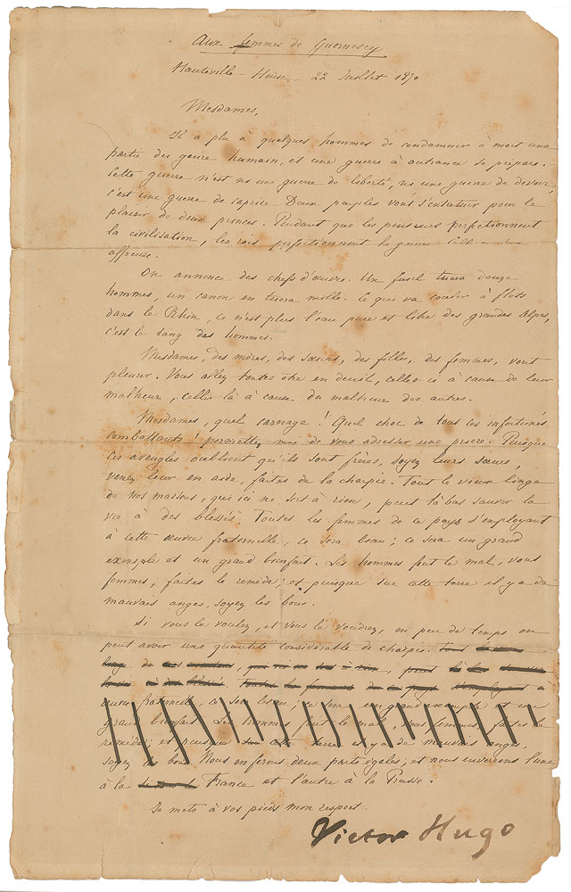 LS in French, one page, 8.5 x 13.5, July 22, 1870. Hugo’s open letter entitled “To the Women of Guernsey,” written from his home at Hauteville House on the eve of the Franco-Prussian War. In part (translated): "It has pleased to a few men to sentence to death part of mankind, and an outrageous war is brewing. This war is not a war of liberty, nor a war of duty, it is a war of caprice. Two nations are going to kill each other for two prince’s pleasure. While thinkers perfect civilization, kings perfect war. This one will be atrocious. Chef-d’oeuvre is announced. A rifle kills twelve men, a canon will kill a thousand. What will flow in the Rhine, it is not pure and free water from the great Alps, anymore, it is blood of men. Mesdames, some mothers, sisters, daughters, women, are going to cry. You are all going to be in mourning, the ones here because of their misfortune, the ones there because of the misfortune of others. Mesdames, what carnage! What shock for all these unfortunate combatants! Allow me to send a prayer to you. Since these blinds forget that they are brothers, be their sisters, come to help them, make shreds from all the old household linen, of no use here, which can save lives of wounded over there. All the women of this country working on this brotherly act of kindness, it will be beautiful; it will be a great example and a great service. Men do evil, you women, do the remedy; and since there are bad angels on this earth, be the good ones. If you want, and you will want, a little time we can have a considerable quantity of shredded linen…We will make two equal parts; and we will send one to France and one to Prussia.” In very good condition, with repaired partial separations to intersecting folds.