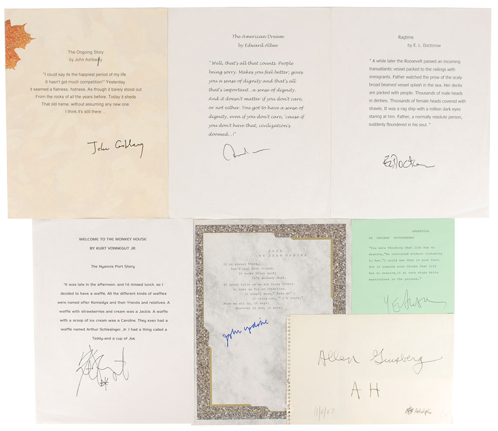 Group of seven items signed by notable authors and poets, consisting mostly of TQSs signed in various ink types. Signers include: Allen Ginsberg (signature), John Ashbery, Edward Albee, E. L. Doctorow, John Updike, Yevgeny Yevtushenko, and Kurt Vonnegut. In overall fine condition. Pre-certified PSA/DNA.