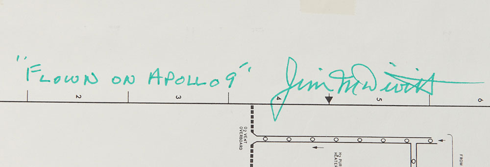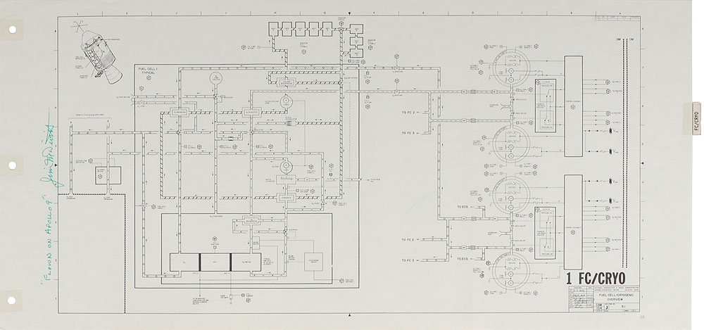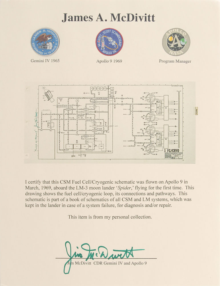 Flown Apollo 9 CSM overview schematic for the fuel cell/cryogenic system, 22 x 10.5, vertically signed and flight-certified in the left margin in green felt tip, "'Flown on Apollo 9,' Jim McDivitt." The schematic bears an affixed tab to the right side, "FC/Cryo," and diagrams the connections and pathways for Fuel Cell 1, as well as general hardware locations within the Command Module to the upper left. In fine condition. Accompanied by a signed letter of provenance from McDivitt, in part: "This CSM Fuel Cell/Cryogenic schematic was flown on Apollo 9 in March, 1969, aboard the LM-3 moon lander 'Spider,' flying for the first time...This schematic is part of a book of schematics of all CSM and LM systems, which was kept in the lander in case of a system failure, for diagnosis and/or repair. This item is from my personal collection." The fuel cells and cryogenic oxygen tanks are the systems that would later catastrophically fail during Apollo 13, and Fuel Cell 1 in particular was a key point of failure. A superb example of a page from an early flown Apollo manual.