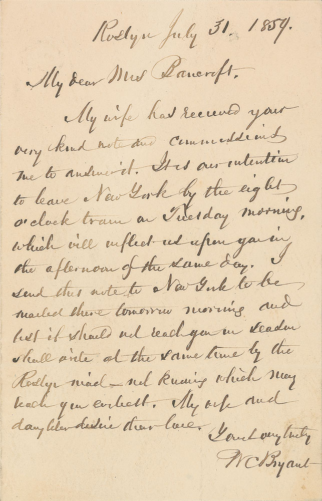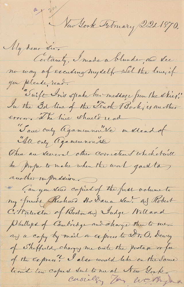 Two ALSs, each signed “W. C. Bryant,” one page, dated 1854 and 1870. The first, in part: “It is our intention to leave New York by the eight o’clock train on Tuesday morning.” The second, in part: “In the 3d line of the Tenth Book is another error. The line should read, ‘Save only Agamemnon’ instead of ‘All only Agamemnon.’ There are several other corrections which will be proper to make when the work goes to another impression.” In overall very good to fine condition. Pre-certified PSA/DNA.