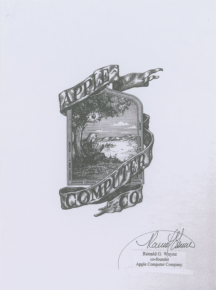 Co-founder of Apple Computer along with Steve Jobs and Steve Wozniak (born 1934). Laserprint copy of the original logo design for Apple Computer Co., 7.5 x 10, signed in the lower right in black ink, “Ronald G. Wayne,” over his embossed personal seal. In fine condition. Wayne received a 10% stake in Apple as one of the company’s three founding partners, but he relinquished his equity only two weeks later for the sum of $800. He was the designer of this logo, which depicts Isaac Newton under a tree with an apple dangling above. Pre-certified PSA/DNA.