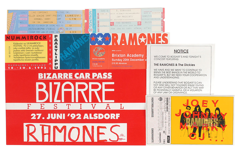 Collection of tickets and passes for various Ramones engagements, including: a ticket for B'Ginnings on June 21, 1977; a ticket for Lake Compounce on June 29, 1990; a ticket for Brixton Academy on December 20, 1992; a ticket for the Hamburg Docks on November 27, 1991; a ticket for Nummirock on June 18-20, 1992; and a car pass for the Bizarre Festival on June 27, 1992. In very good to fine condition. From The Monte A. Melnick Ramones Collection.