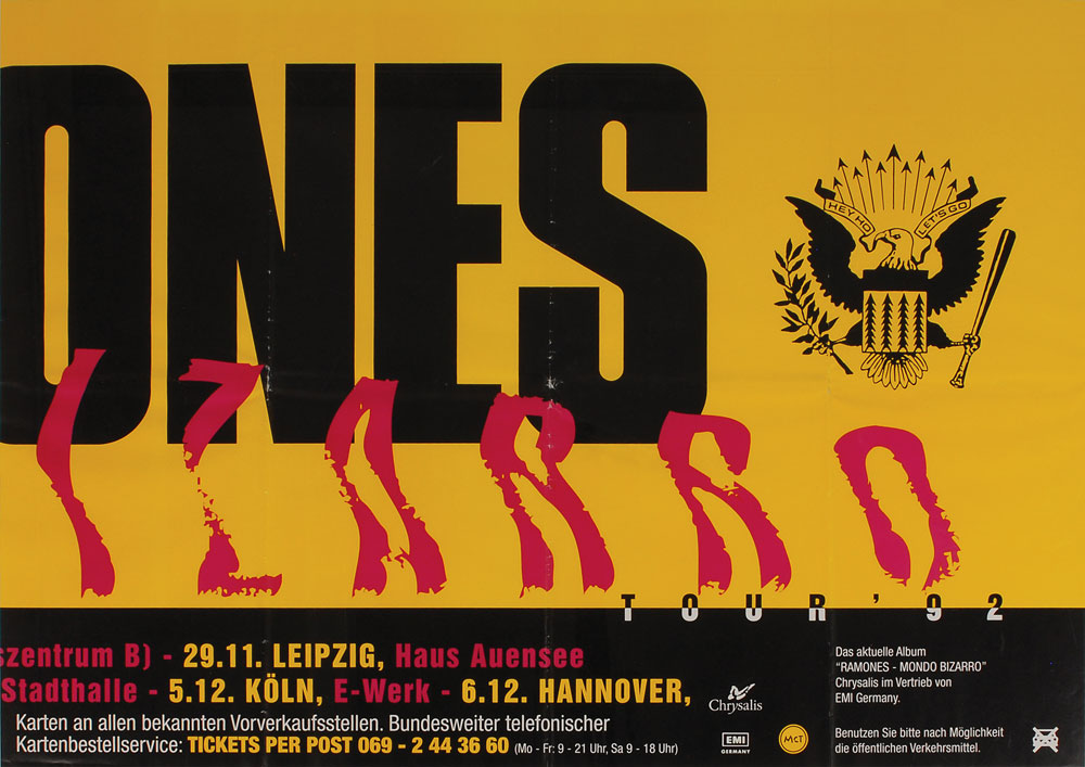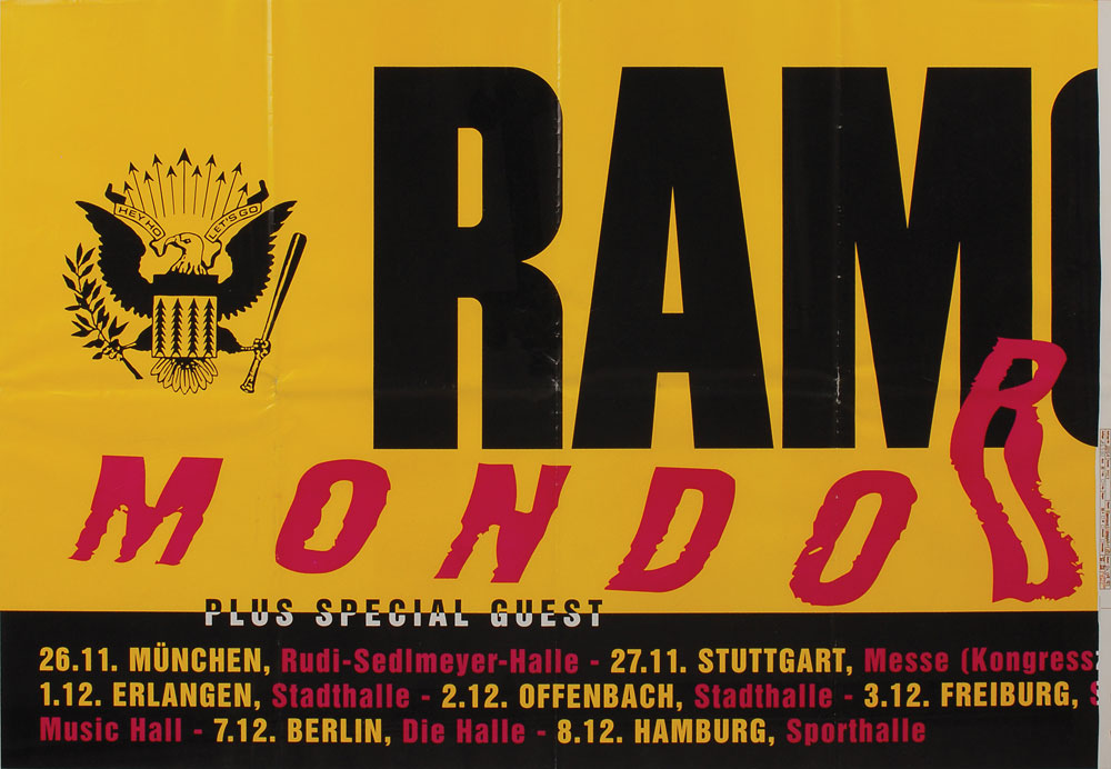 Huge two-piece concert poster promoting the Ramones' 1992 Mondo Bizarro tour in Germany, 66 x 23.25 (measured together), listing a total of ten concert dates below a large Ramones logo bookended by presidential seals. In very good to fine condition, with a few tears at intersection points. From The Monte A. Melnick Ramones Collection.