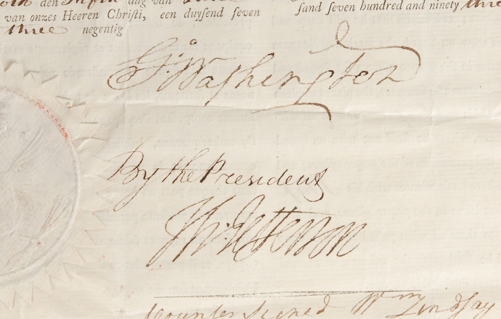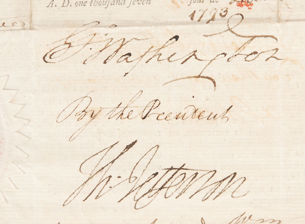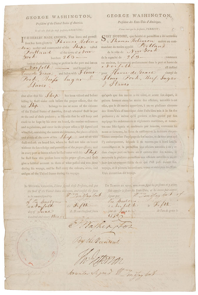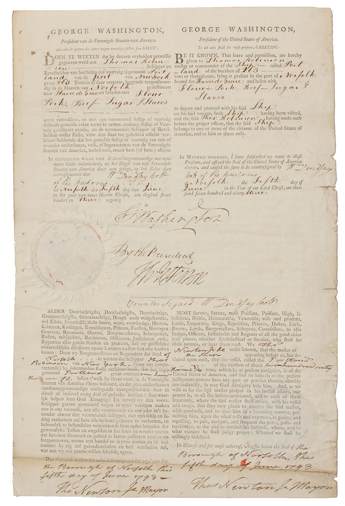 Scarce and desirable partly-printed DS, signed twice as president, “Go: Washington,” and twice “Th: Jefferson” as secretary of state, one page both sides, 10.25 x 15.5, June 5, 1793. Three language ship’s paper, with Dutch and English on one side, and English and French on the other, issued to “Thomas Robinson master or commander of the Ship called Portland…lying at present in the port of Norfolk bound for Havre de Grace and laden with Flour, Pork, Beef, Sugar & Staves.” Both sides are boldly signed by President Washington and Secretary of State Jefferson, and both sides retain their embossed white paper seals. In very good to fine condition, with scattered wrinkling and creasing, tiny binding holes along one edge and three small holes to upper blank area, and a few short edge tears. All four signatures are bold and unaffected, and Jefferson’s signature is perhaps the largest we’ve ever seen.