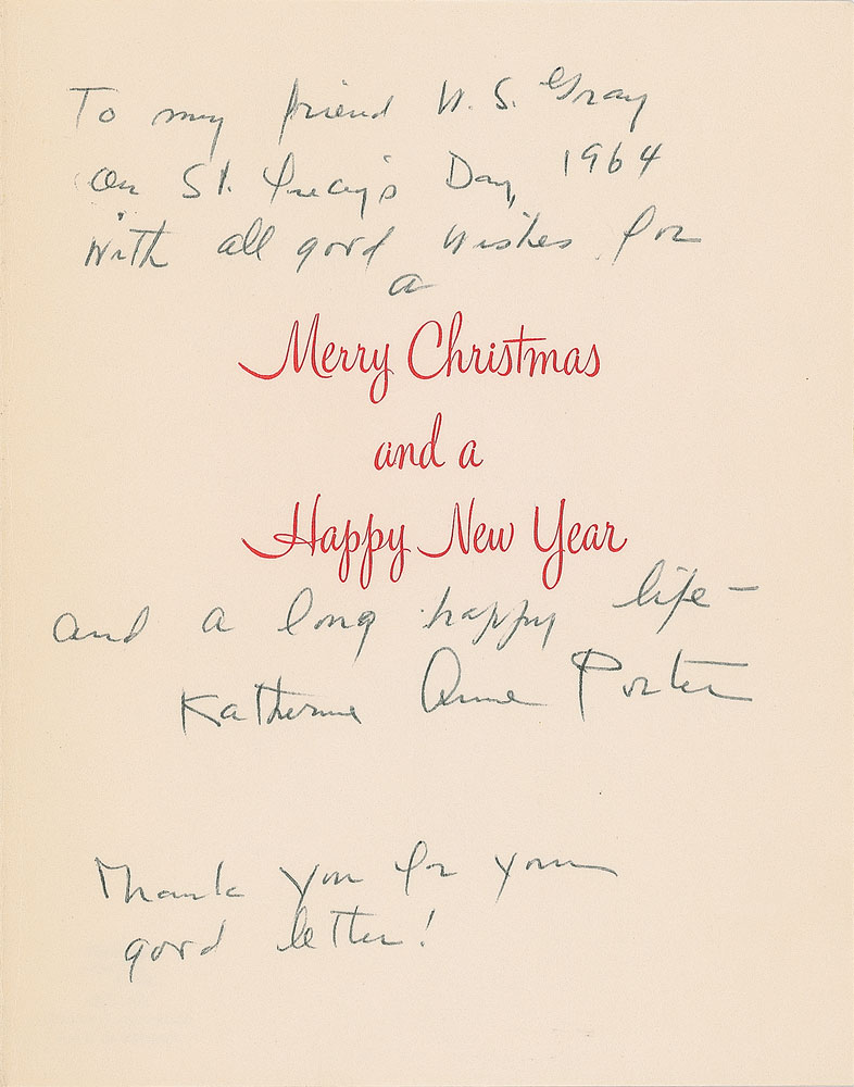 Pulitzer Prize–winning American writer (1890–1980) best known for such enduring stories as ‘The Jilting of Granny Weatherall’ and the novel Ship of Fools. Christmas card from 1964 featuring colorful holiday artwork on the front, measuring 5 x 6.5 closed, thoughtfully signed and inscribed inside in black ballpoint by Porter. In fine condition. Accompanied by the original mailing envelope addressed in her own hand, including her initials, “KAP,” in the return address on the flap. Pre-certified PSA/DNA.